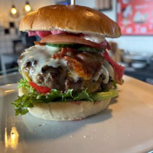250g bøf, hj. Syltede rødløg, 2 slags ost, bacon, salat, dressing, tomat og agurk